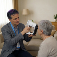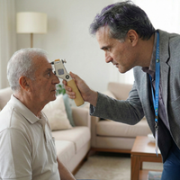 O atendimento é realizado com aparelhos específicos para exame ocular em ambiente domiciliar: